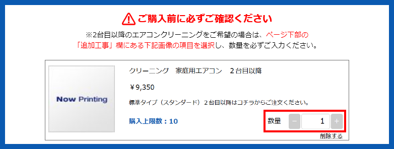 2台目以降をご希望される場合は、下の「追加工事」から「クリーニング 家庭用アイコン 2台目以降」に数量を入力ください。