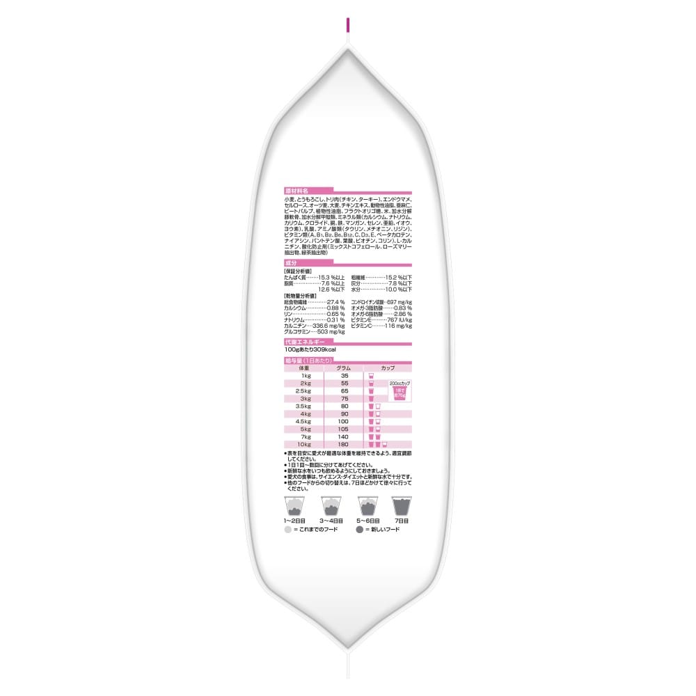 ●成分:小麦、とうもろこし、トリ肉(チキン、ターキー)、エンドウマメ、セルロース、オーツ麦、大麦、チキンエキス、動物性油脂、亜麻仁、ビートパルプ、植物性油脂、フラクトオリゴ糖、米、加水分解豚軟骨、加水分解甲殻類、ミネラル類(カルシウム、ナトリウム、カリウム、クロライド、銅、鉄、マンガン、セレン、亜鉛、イオウ、ヨウ素)、乳酸、アミノ酸類(タウリン、メチオニン、リジン)、ビタミン類(A、B1、B2、B6、B12、C、D3、E、ベータカロテン、ナイアシン、パントテン酸、葉酸、ビオチン、コリン)、L-カルニチン、酸化防止剤(ミックストコフェロール、ローズマリー抽出物、緑茶抽出物)