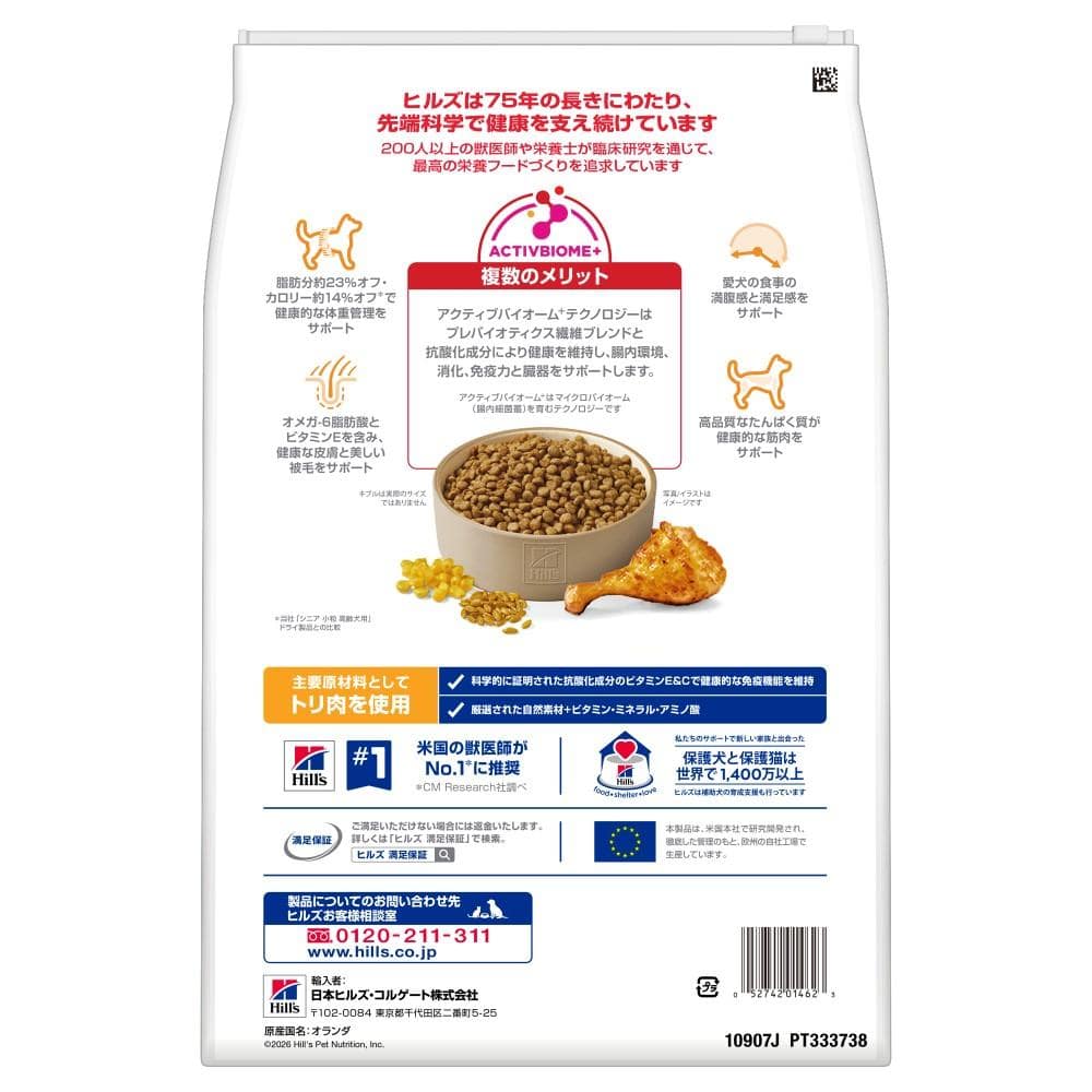 ●ヒルズ「シニア 小粒 高齢犬用」ドライ製品と比較して、脂肪分約23%オフ・カロリー約14%オフで、個体本来の理想的な体重維持をサポートします。