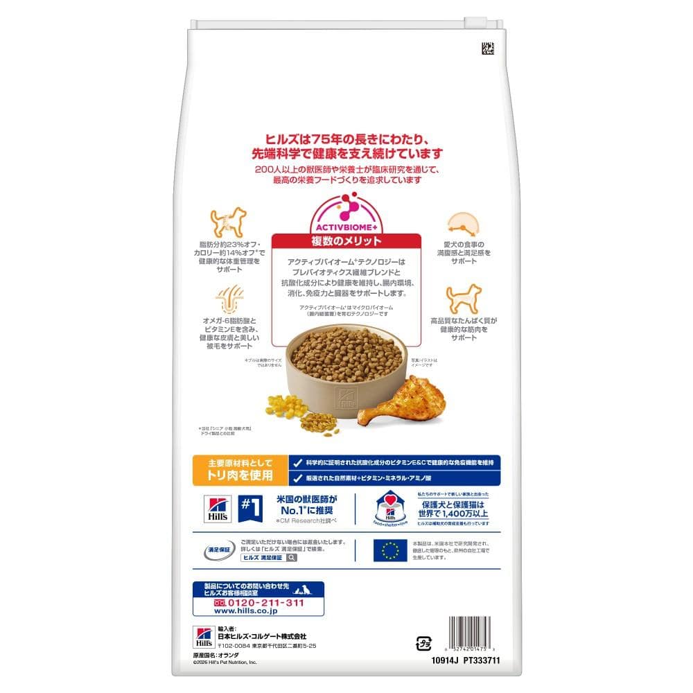 ●ヒルズ「シニア 小粒 高齢犬用」ドライ製品と比較して、脂肪分約23%オフ・カロリー約14%オフで、個体本来の理想的な体重維持をサポートします。