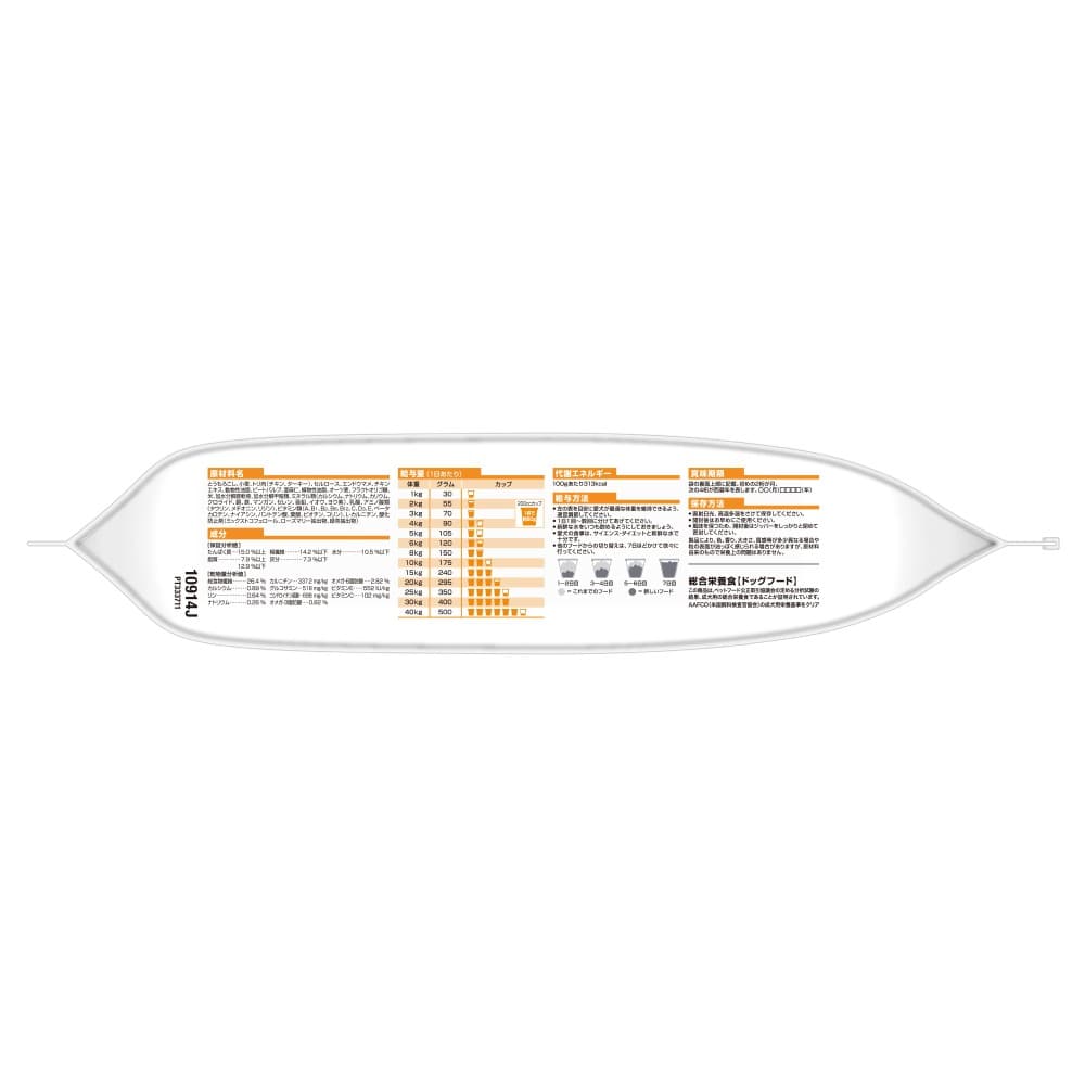 ●成分:とうもろこし、小麦、トリ肉(チキン、ターキー)、セルロース、エンドウマメ、チキンエキス、動物性油脂、ビートパルプ、亜麻仁、植物性油脂、オーツ麦、フラクトオリゴ糖、米、加水分解豚軟骨、加水分解甲殻類、ミネラル類(カルシウム、ナトリウム、カリウム、クロライド、銅、鉄、マンガン、セレン、亜鉛、イオウ、ヨウ素)、乳酸、アミノ酸類(タウリン、メチオニン、リジン)、ビタミン類(A、B1、B2、B6、B12、C、D3、E、ベータカロテン、ナイアシン、パントテン酸、葉酸、ビオチン、コリン)、L-カルニチン、酸化防止剤(ミックストコフェロール、ローズマリー抽出物、緑茶抽出物)
