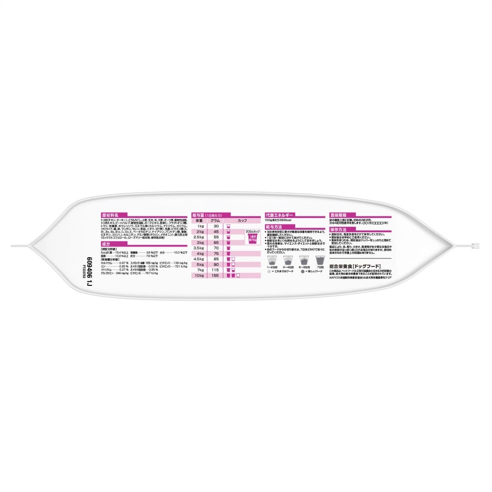 ●成分:トリ肉(チキン、ターキー)、とうもろこし、小麦、玄米、米、大麦、オーツ麦、動物性油脂、トリ肉エキス、ビートパルプ、植物性油脂、ポークエキス、亜麻仁、フラクトオリゴ糖、トマト、柑橘類、ホウレンソウ、ミネラル類(カルシウム、ナトリウム、カリウム、クロライド、銅、鉄、マンガン、セレン、亜鉛、イオウ、ヨウ素)、乳酸、ビタミン類(A、B1、B2、B6、B12、C、D3、E、ベータカロテン、ナイアシン、パントテン酸、葉酸、ビオチン、コリン)、L-カルニチン、アミノ酸類(タウリン、メチオニン)、酸化防止剤(ミックストコフェロール、ローズマリー抽出物、緑茶抽出物)