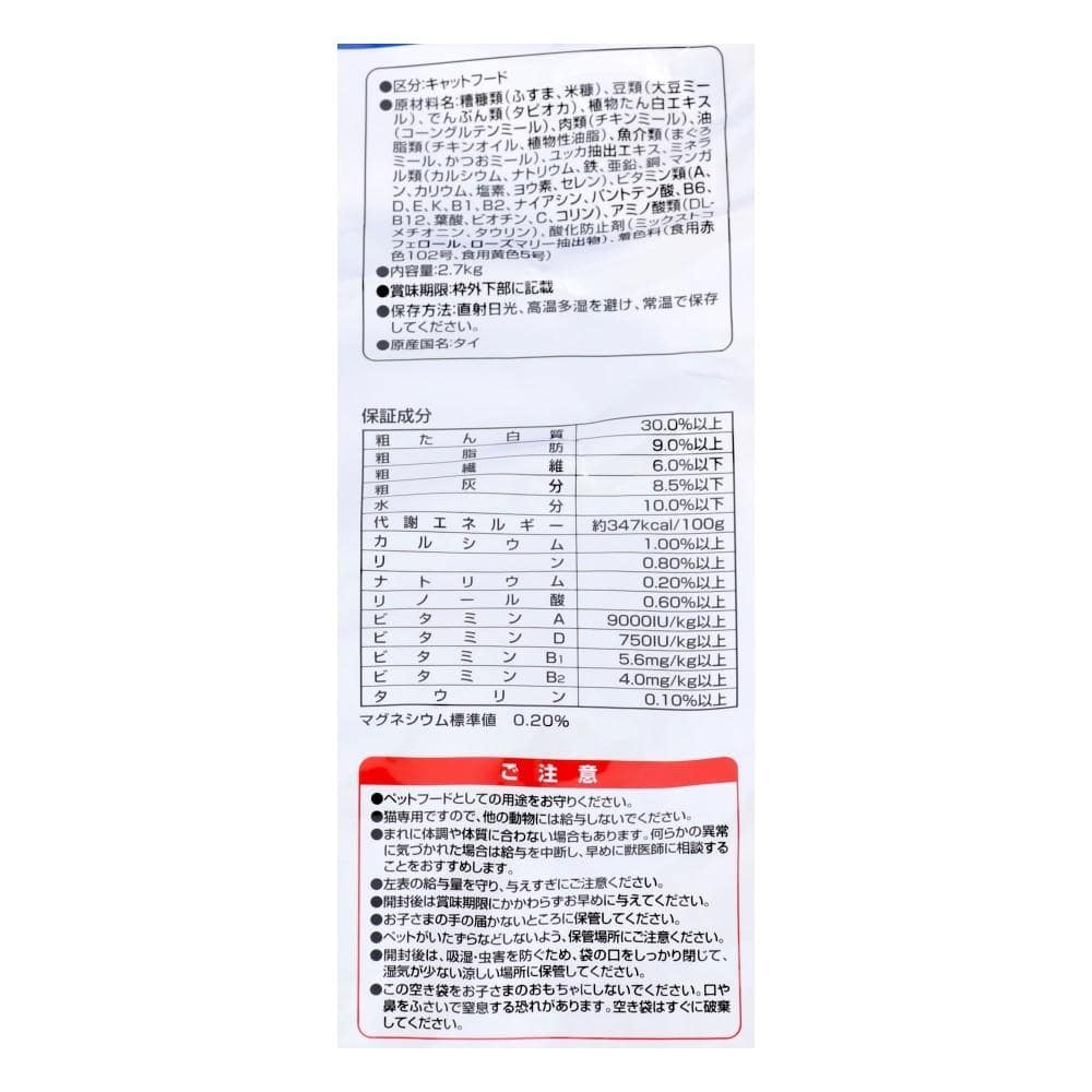 ●保証成分:粗たんぱく質30.0%以上、9.0%以上、6.0%以下、粗繊維6.0%以下、粗灰分8.5%以下、水分10.0%以下、代謝エネルギー約347kcal/100g、カルシウム1.00%以上、リン0.8%以上、ナトリウム0.2%以上、リノール酸0.6%以上、ビタミンA9000lU/kg以上、ビタミンD750lU/kg以上、ビタミンB1 5.6mg/kg以上、ビタミンB2 4.0mg/kg以上、タウリン0.1%以上
