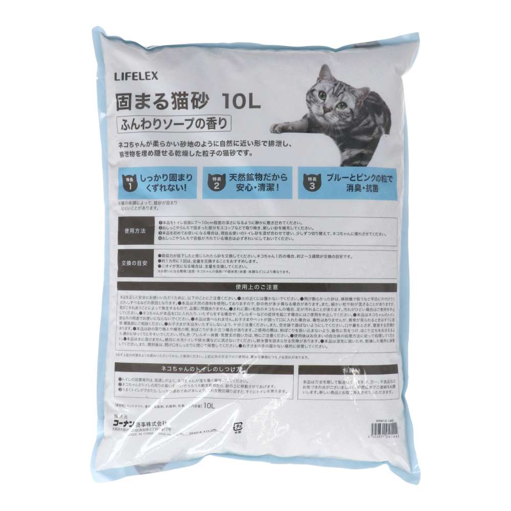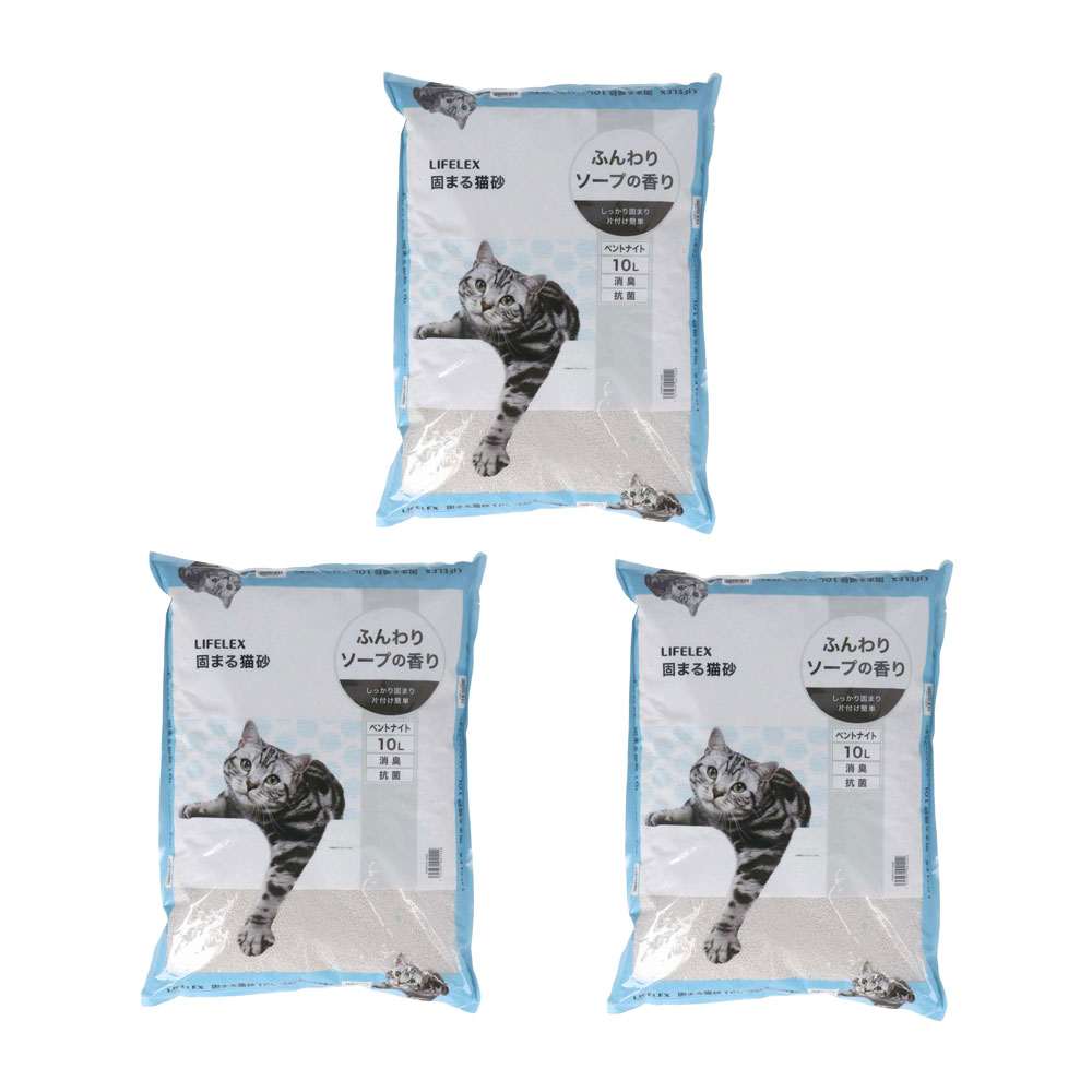 LIFELEX 猫砂 鉱物系 ベントナイト 固まる猫砂 小粒 細かい砂 消臭 抗菌 ふんわりソープの香り 10L 3個セット