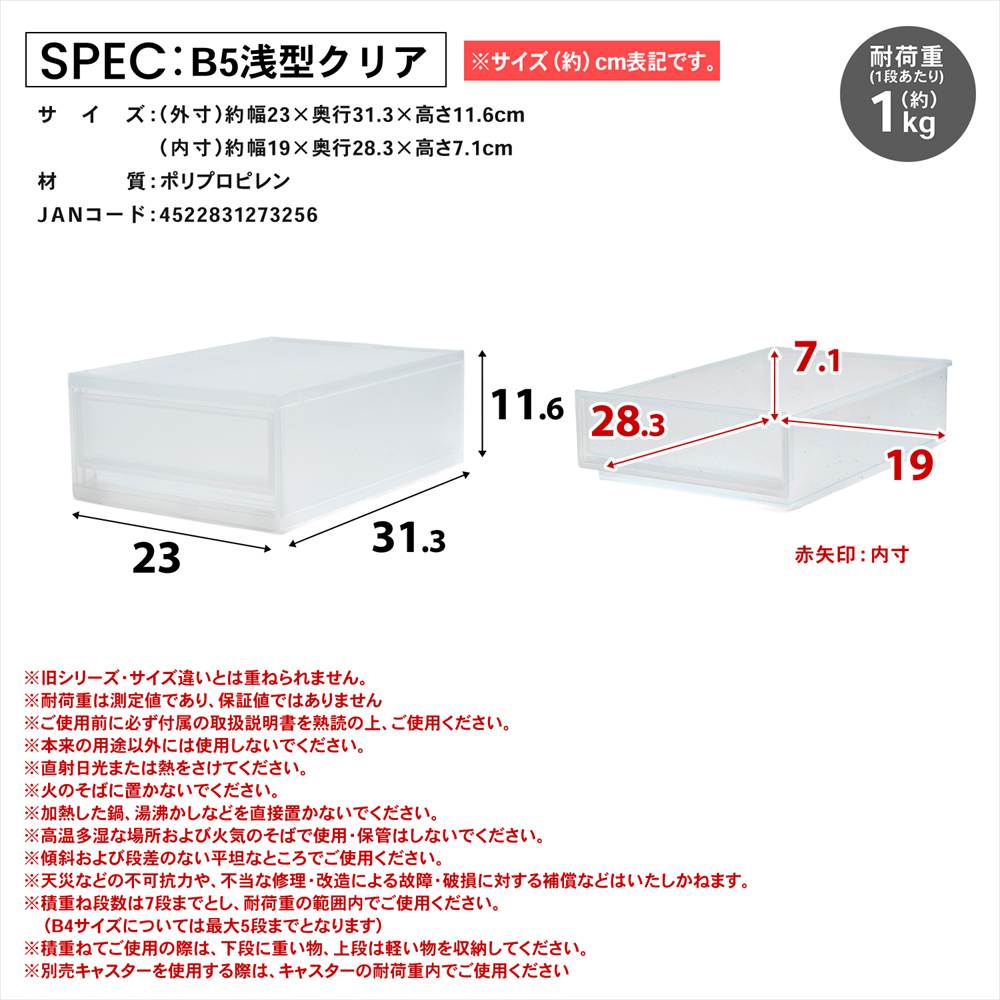 ※積重ねてご使用の際は、下段に重い物、上段は軽い物を収納してください。