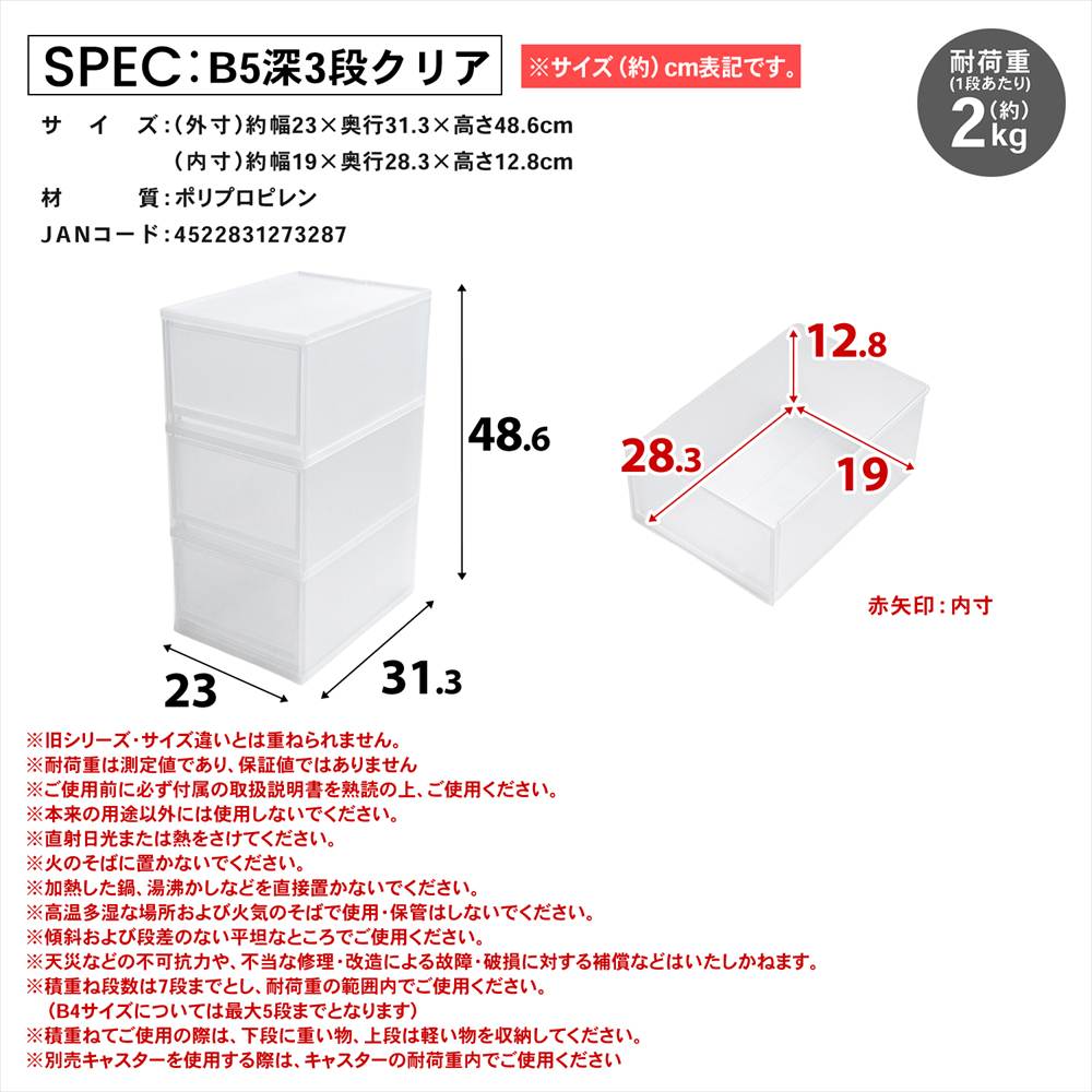 ※積重ねてご使用の際は、下段に重い物、上段は軽い物を収納してください。