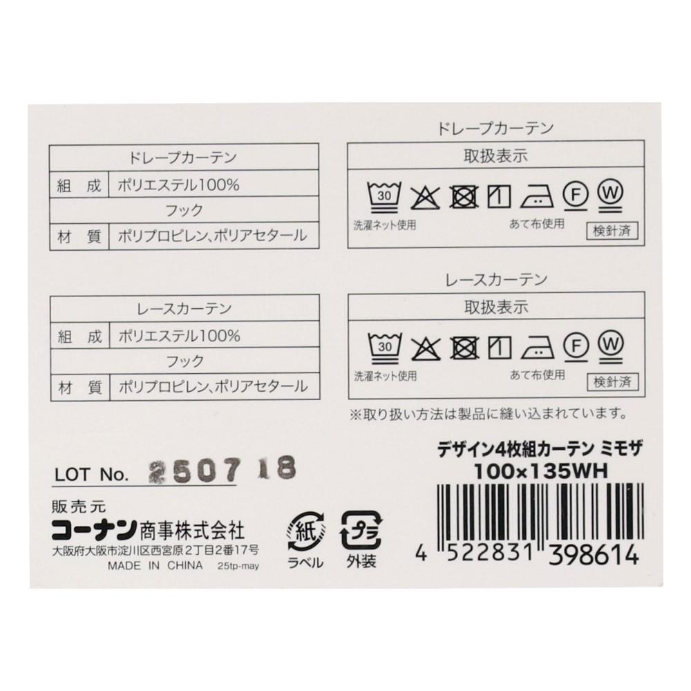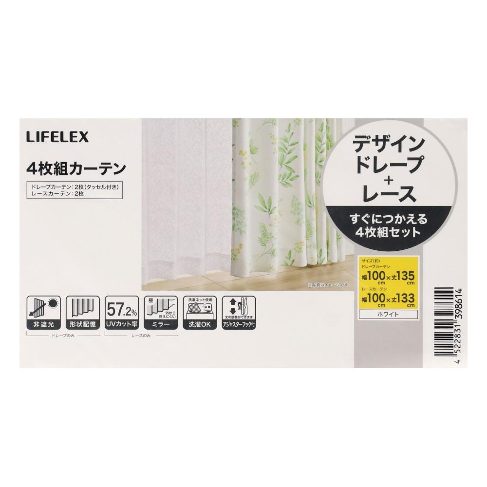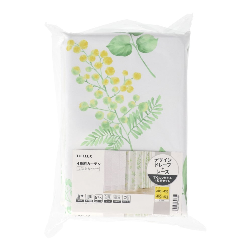 LIFELEX デザイン4枚組カーテン ミモザ 約幅100×丈135cm レース丈約133cm ホワイト