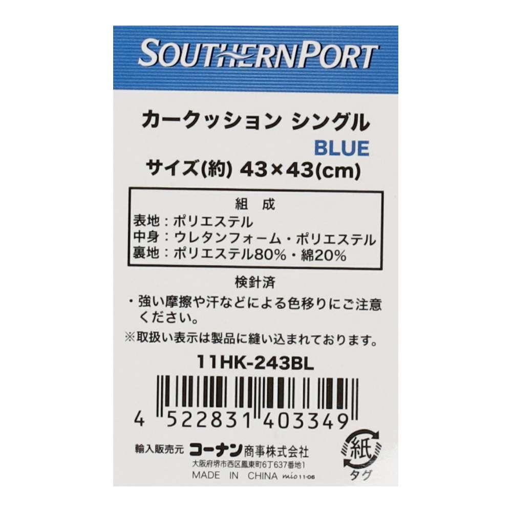 - > カークッションシングル ブルー 11HK-243BL