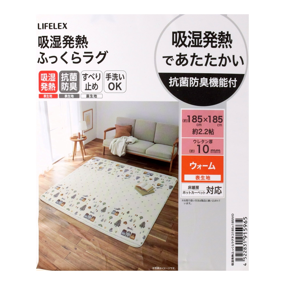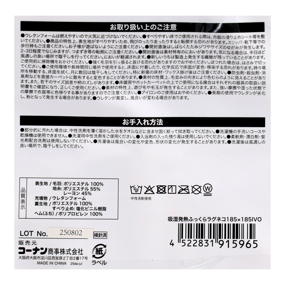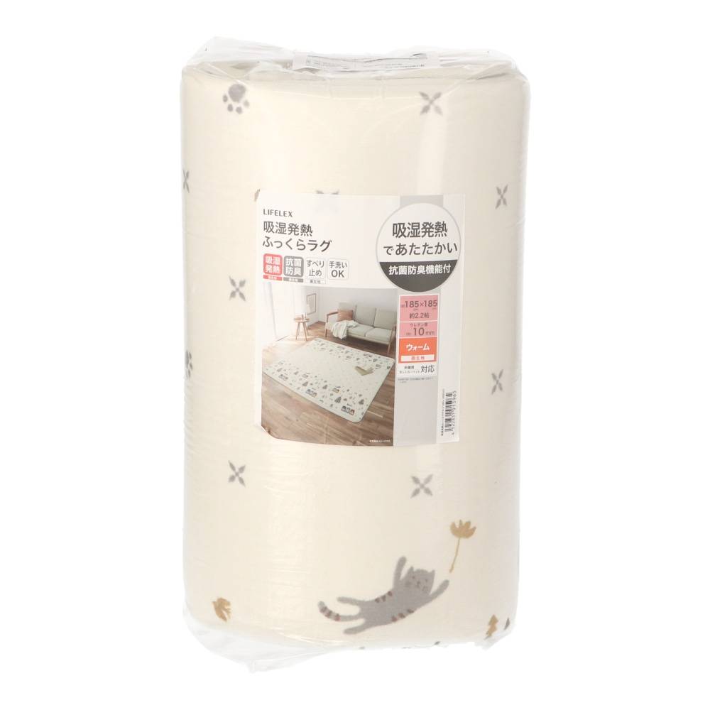 LIFELEX 吸湿発熱ふっくらラグ ネコ 185×185 アイボリー