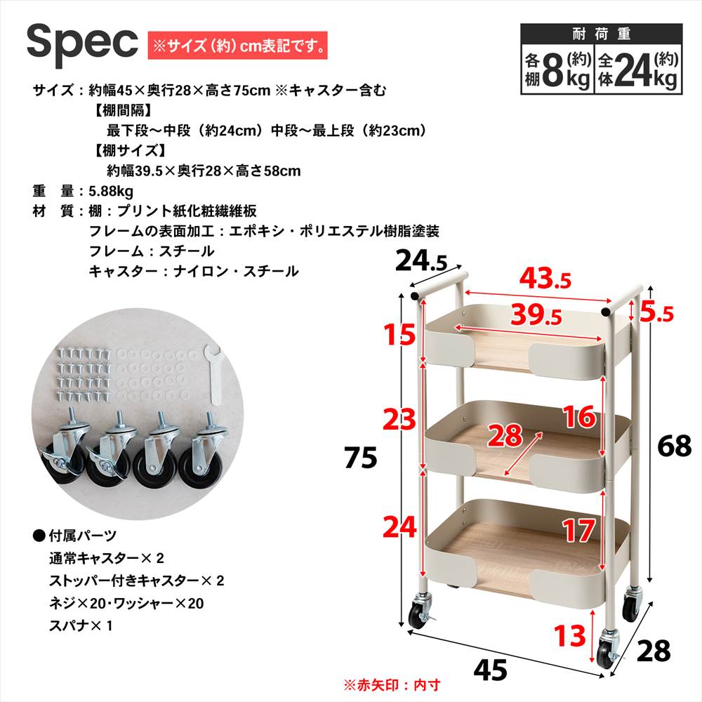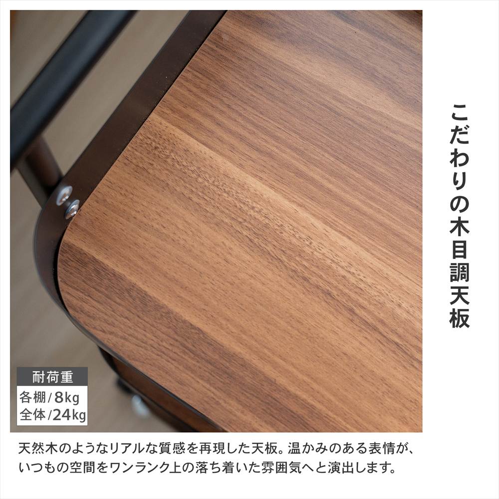 ●材質:棚/プリント紙化粧繊維板、フレームの表面加工/エポキシ・ポリエステル樹脂塗装、フレーム/スチール、キャスター/ナイロン・スチール