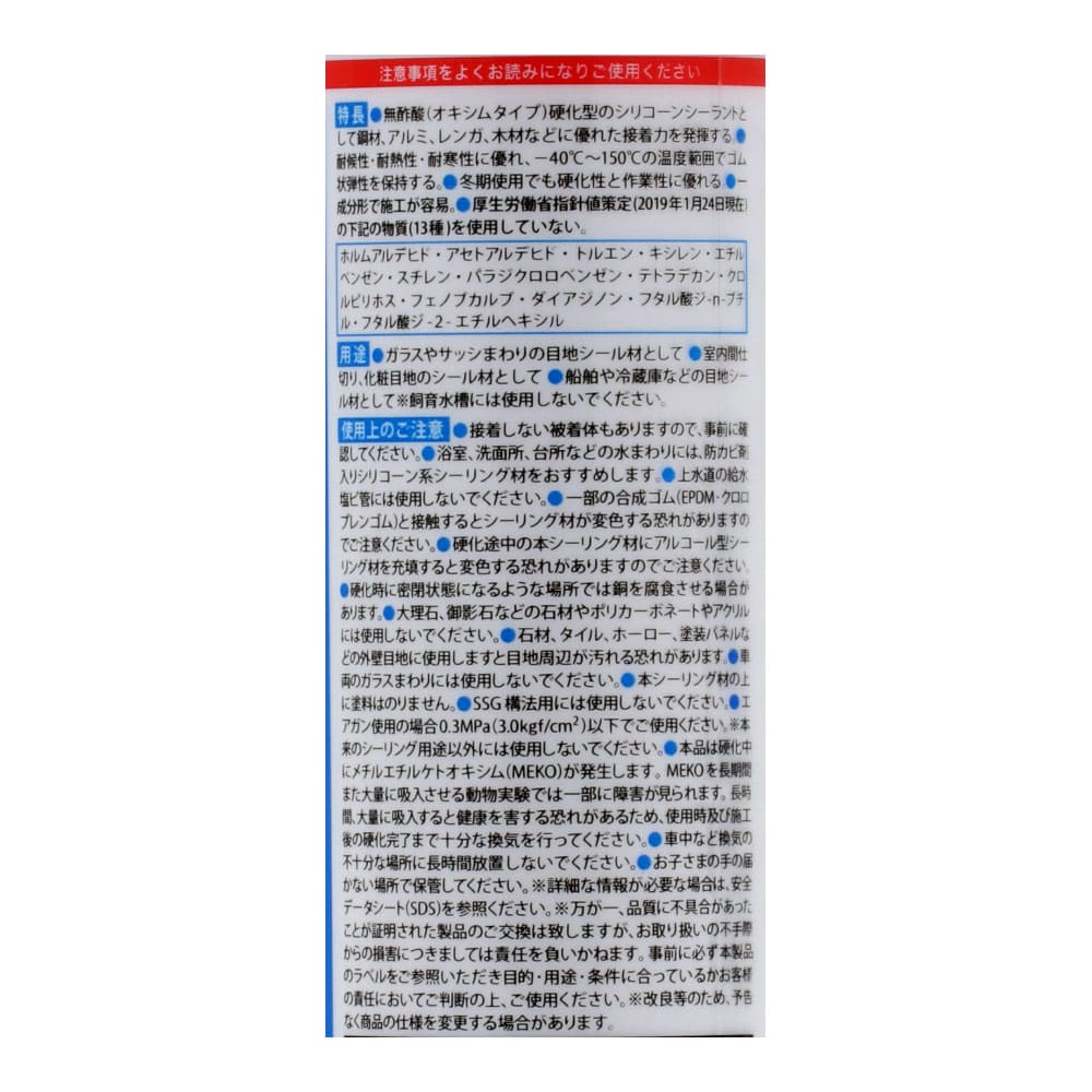 ●無酢酸(オキシムタイプ)硬化型のシリコンシーラントとして鋼材、アルミ、レンガ、木材などに優れた接着力を発揮