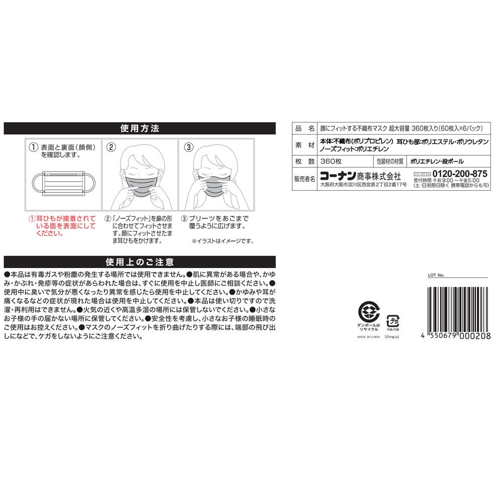●素材:本体/不織布(ポリプロピレン)、耳ひも部/ポリエステル・ポリウレタン、ノーズフィット/ポリエチレン