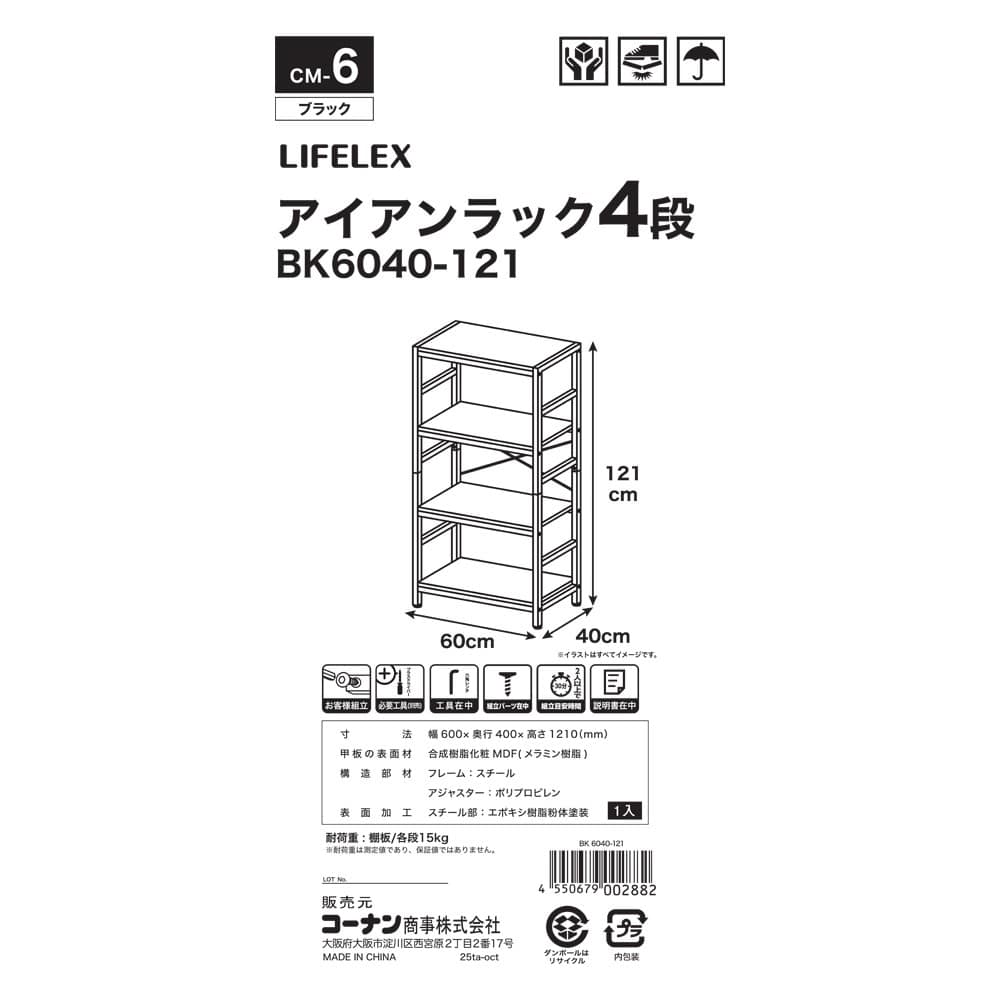 LIFELEX ラック 棚 アイアンラック 4段 ブラック 幅60 スチール製 木目調 収納棚 オープンシェルフ ディスプレイラック