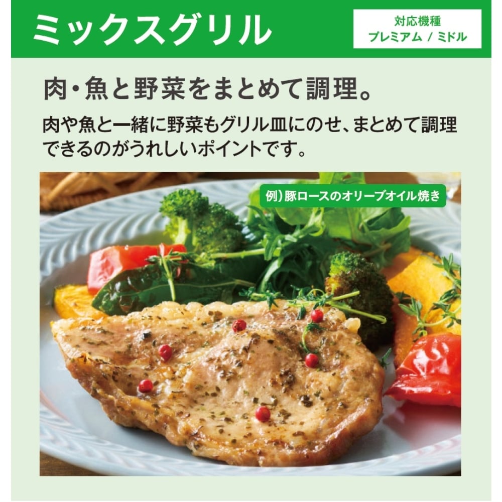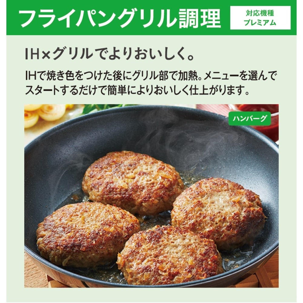 ●フライパングリル調理:IHで焼き色をつけた後にグリル部分で加熱。メニューを選んでスタートするだけで、簡単によりおいしく仕上がります。