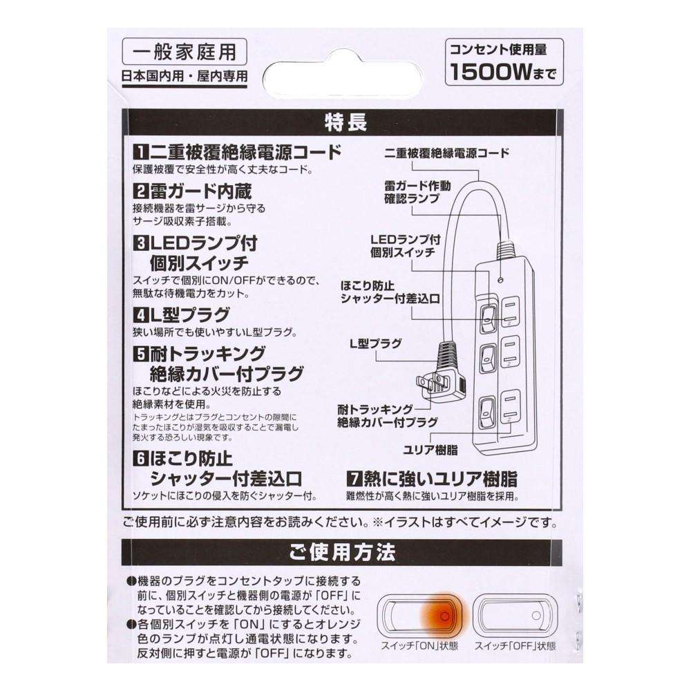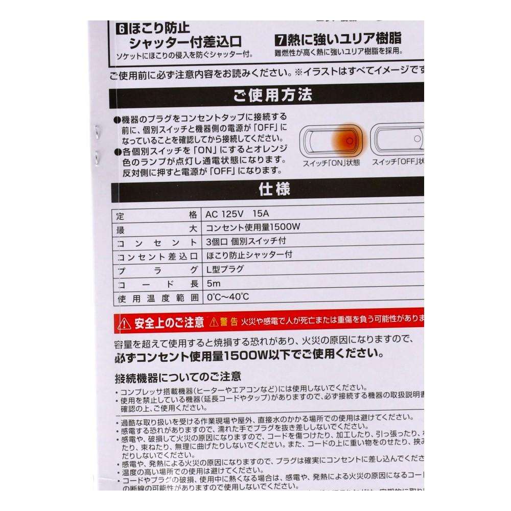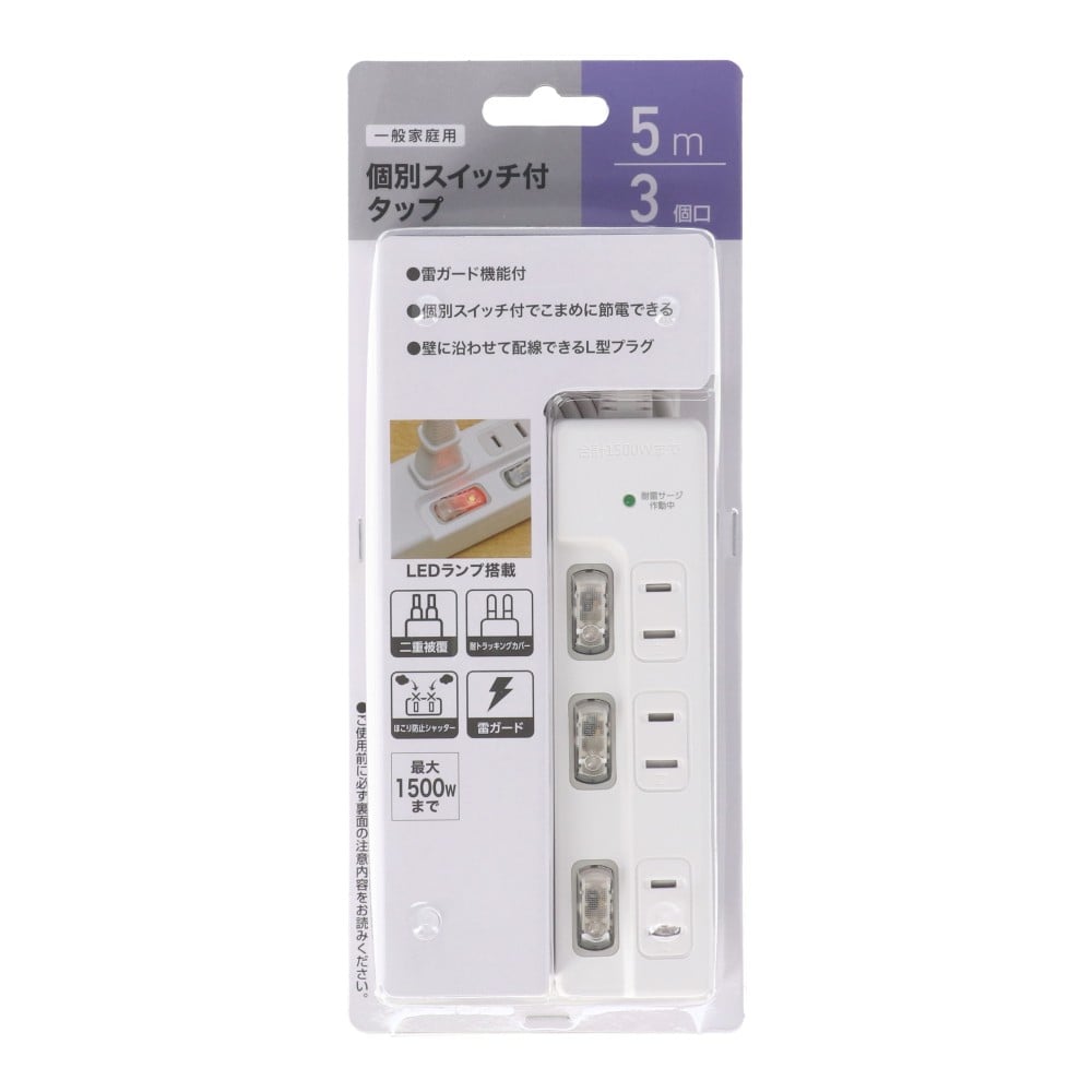 - > 個別スイッチ付タップ 3個口5m ホワイト
