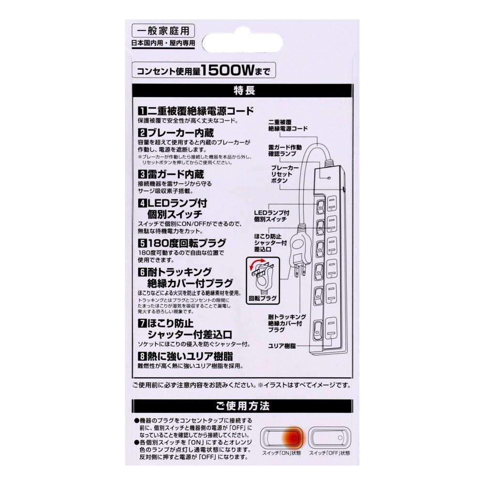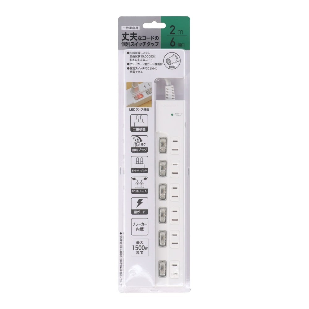 丈夫なコードの個別スイッチ付タップ AC6個口2m ホワイト