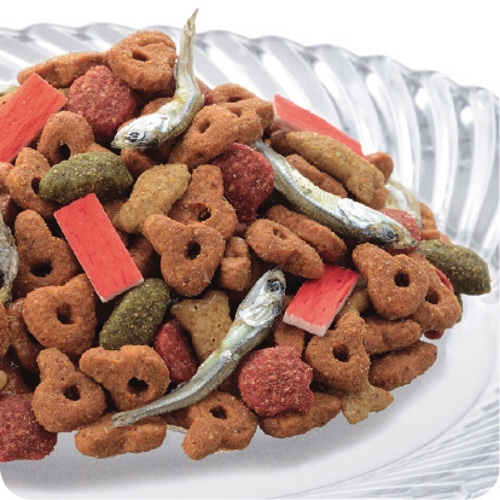 穀類(トウモロコシ、コーングルテンミール、小麦粉、パン粉)、肉類(チキンミール、牛肉粉、豚肉粉)、魚介類(フィッシュミール、小魚、フィッシュパウダー、マグロ節粉、マグロエキス、カツオエキス、小魚粉末、シラスパウダー)、油脂類(植物性油脂、動物性油脂、γ-リノレン酸)、乾燥カニカマ、脱脂大豆、オリゴ糖、ハーブ(タイム、ディル、フェンネル)、野菜類(トマト、ニンジン、ホウレンソウ)、クランベリーパウダー、ミネラル類(カルシウム、リン、カリウム、クロライド、銅、亜鉛、ヨウ素)、pH調整剤、アミノ酸類(タウリン、トリプトファン、メチオニン)、ビタミン類(A、B1、B2、B6、E、K、ニコチン酸、パントテン酸、葉酸、コリン)、酵母細胞壁、着色料(紅麹色素、二酸化チタン、食用赤色102号、食用赤色106号、食用黄色5号、食用青色1号)、調味料、酸化防止剤(ミックストコフェロール、ローズマリー抽出物)、グルコサミン、コンドロイチン