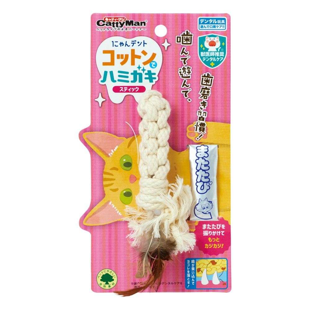 猫用はみがき玩具。またたび粉末付。鳥の羽とまたたび粉末で、猫ちゃんの興味とかじりたい気分を刺激します。