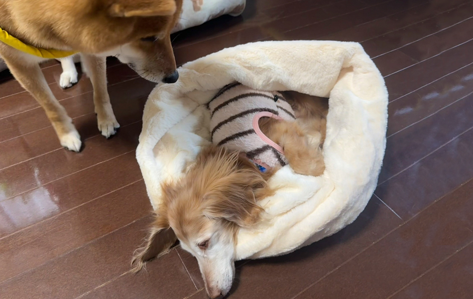 気持ちよく寝てるショコラくんのまわりで、あんこくんがずっとウロウロ、クンクンしています、、、