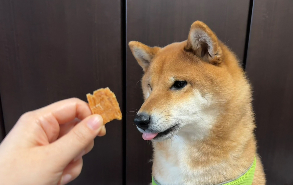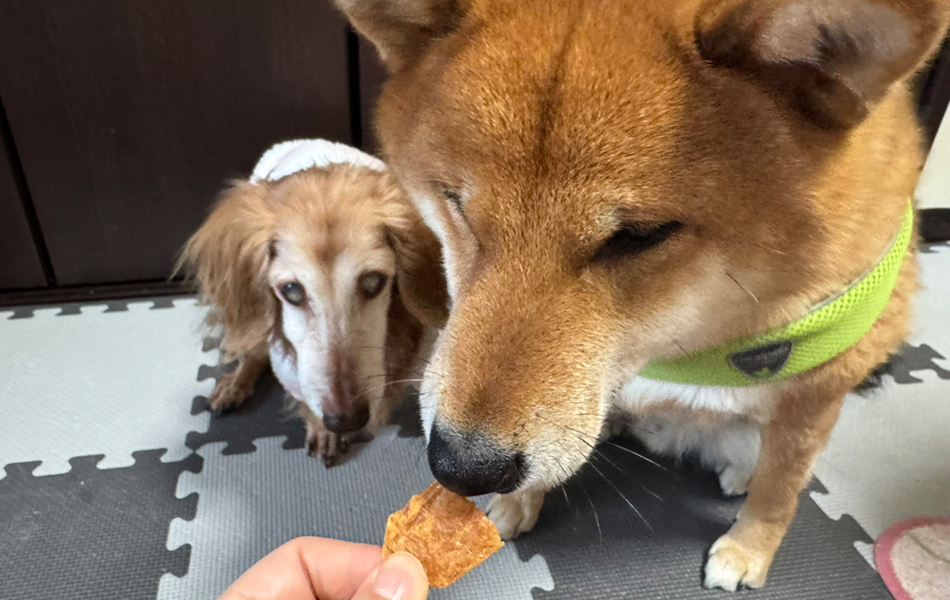 1枚がこんなに大きくて約10cmほどあります!低脂肪な鶏ささみのジャーキーで2匹とも開封後はすぐに近寄ってきます(笑)