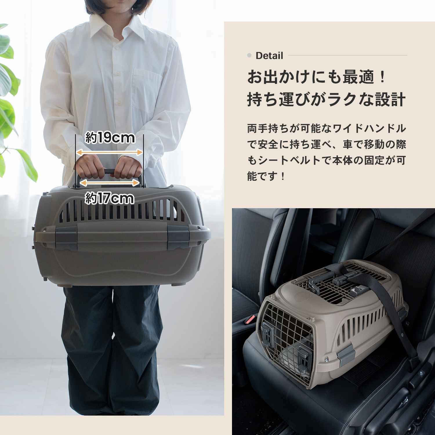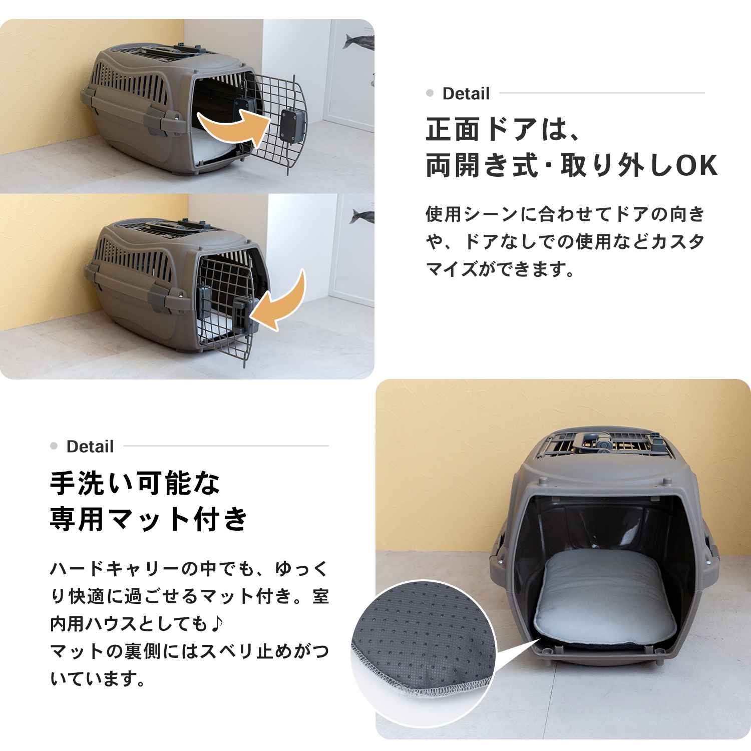 外出先への移動に欠かせないキャリー。丈夫なハードタイプなので、普段のおうちではハウス、外出時はそのままキャリーとして使え、安心感のある移動が可能です。自家用車や交通機関での移動時、外出先での宿泊時に活躍します。
