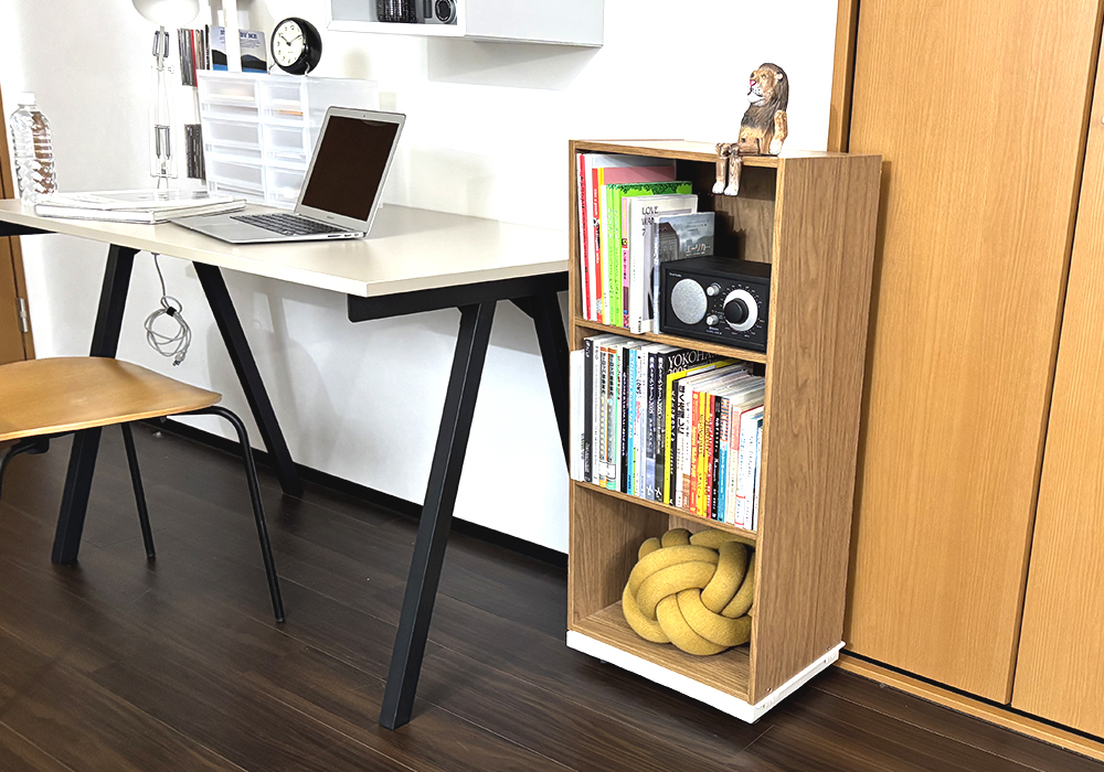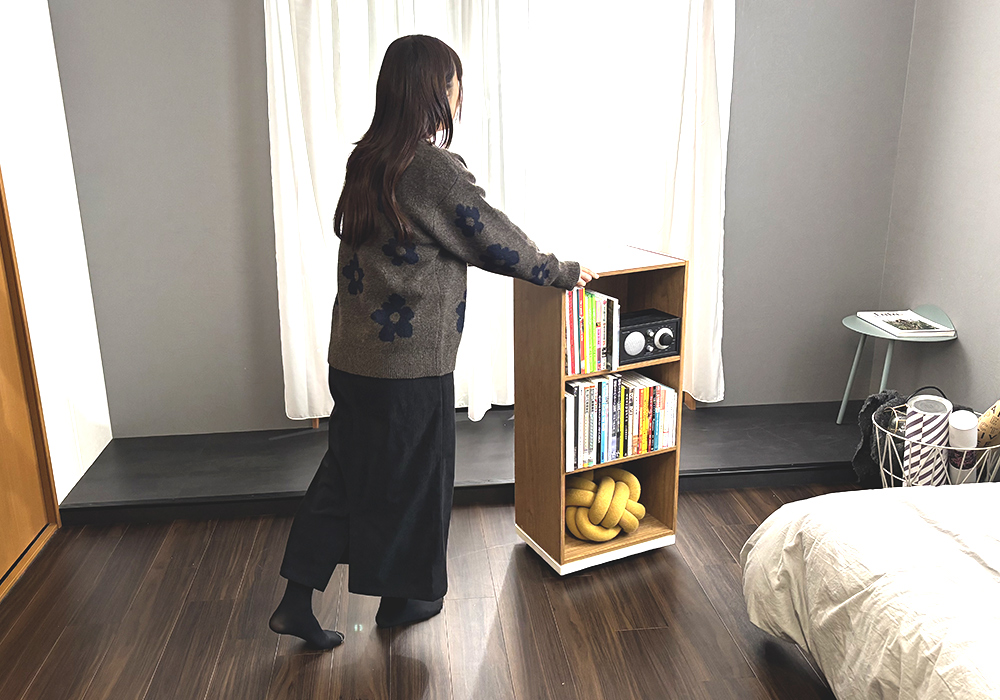 まずは、本やアルバムを収納しているから重くてなかなか動かせない棚の下にインテリアベースをセットしてみました!そうしたら・・・!