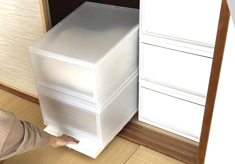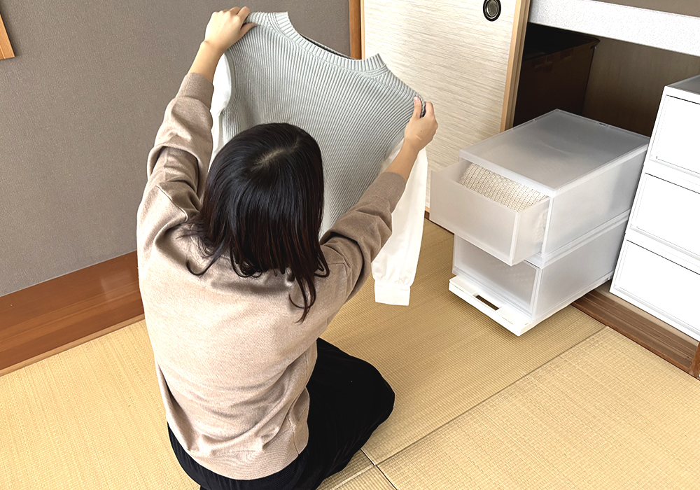 衣装ケースをクローゼットからそのまま手前に引き出せるから、衣替えがしやすいしとっても捗りそう!そうだ、ちょうど少し寒くなってきたから入れ替えようかな・・・どれどれ、あれ!こんな服持ってたっけ?あ!これ懐かしい~!