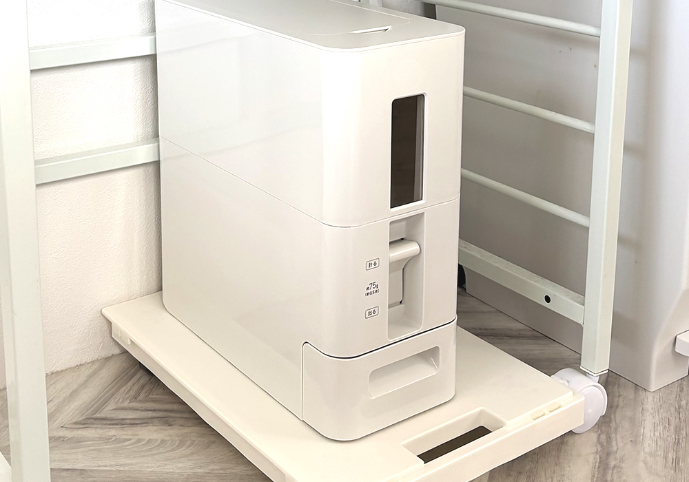 米びつを置くのもオススメ!とのことだったので試してみました。重い米びつを手前にスイーッ!が、快適過ぎる・・・!ついついおコメ炊きすぎちゃいそ~う♪