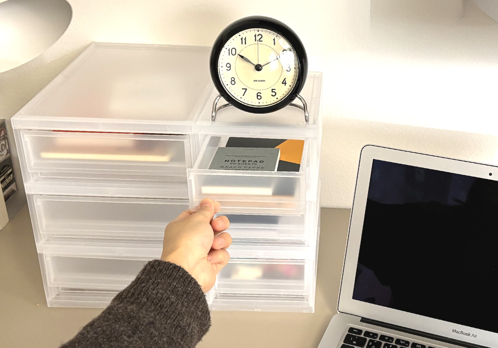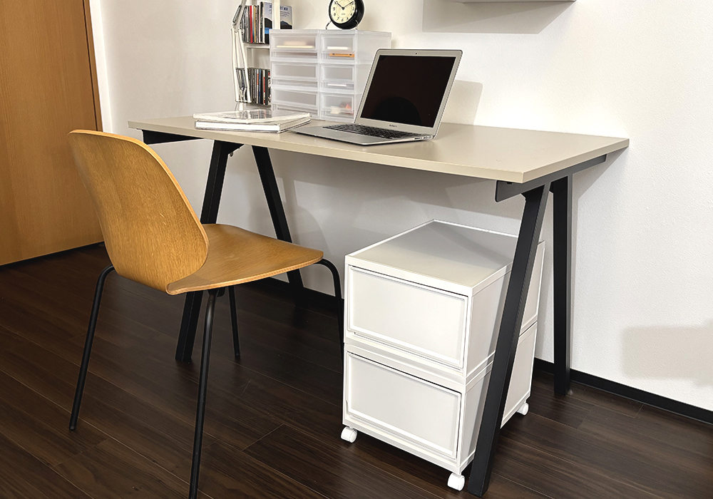 デスク横に置けるタイプも便利。中身がわかりやすいようにラベルを貼って使うのも良いですね!別売りのキャスターを付けると移動もできてさらに◎掃除機をかけたいときにサッとどかせられます。