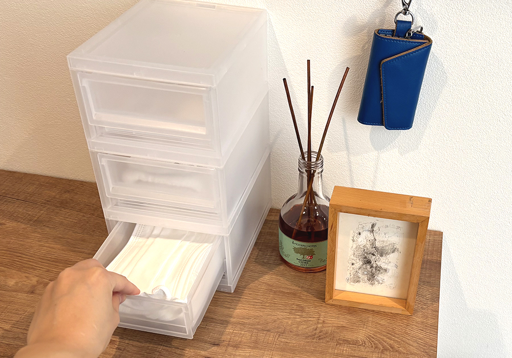 玄関で気づく「マスク忘れた・・・」靴も履いちゃったのに~!そんなことがよくある私ですが、マスク収納用のケースを玄関にセット!そしてハンカチもイン!これで、お出かけ前の「取りに行かなきゃ・・・」がなくなりました!