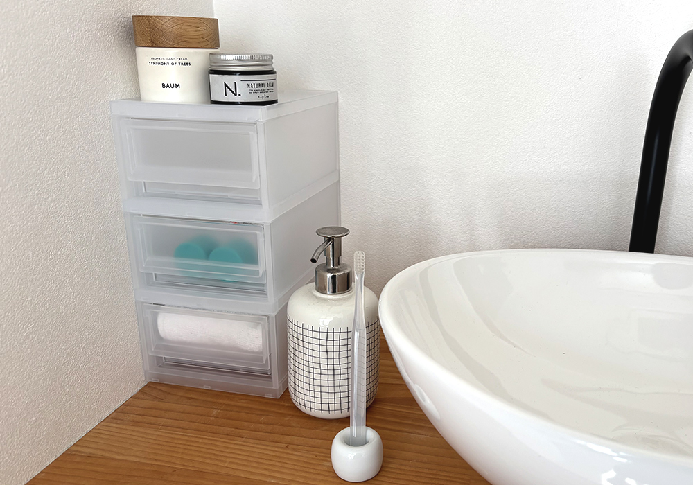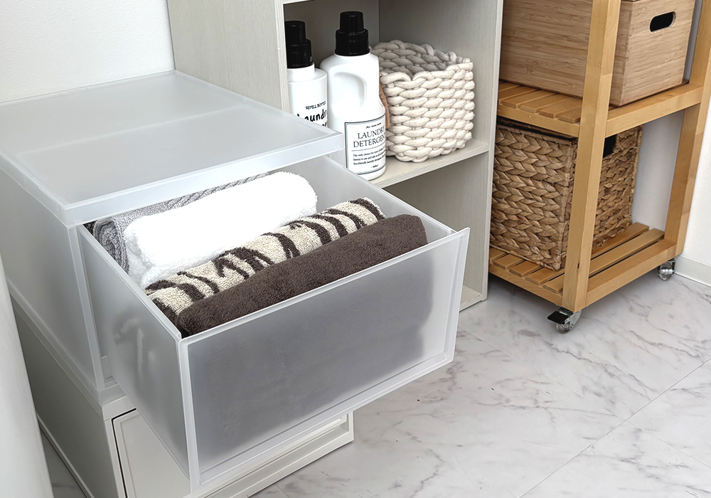 洗面・バスでは、タオル収納や小物収納に。シンプルなデザインだから、清潔感があるしスッキリ見えるのが気に入ってます。