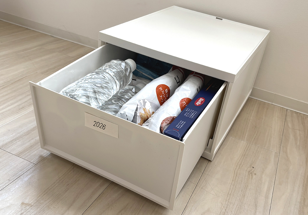 ネットで見ていいな!と思って真似したのが「災害用の備蓄ケースとして使う」こと。年数で分けて備蓄しておくと、期限が切れる前に気が付けて新しく取り替えられてとっても安心♪